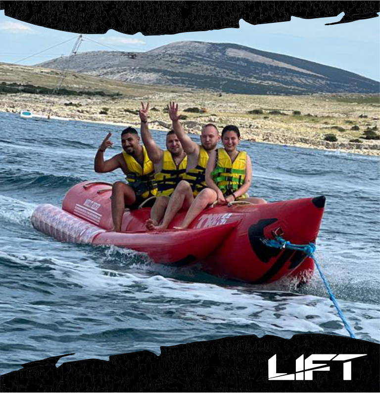 Behind a speedboat banana is ideal to enjoy a good day of fun ride and to experience new adventures. It can carry more people, and it’s very comfortable and pleasant behind a speedboat. Discover the stunning moonscape-like magnificent Island of Pag and panorama view on Zrće Beach!